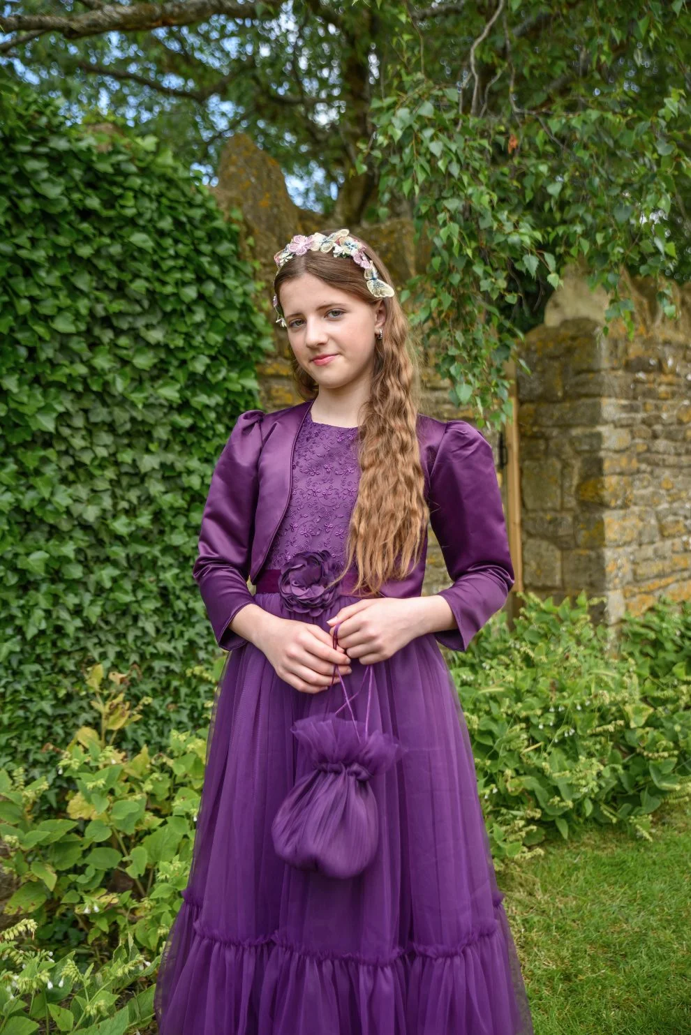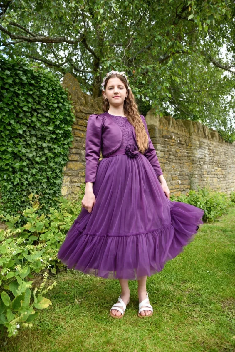 - Skirt: Fluffy, layered tulle skirt in a rich purple hue.