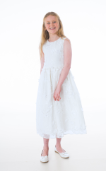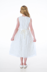 The Tilly white dress features a floral lace bodice, sleeveless design, and a large bow at the back, creating a perfect balance of elegance and charm for any special occasion.