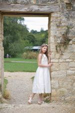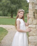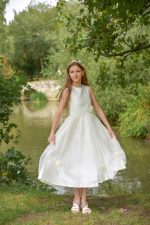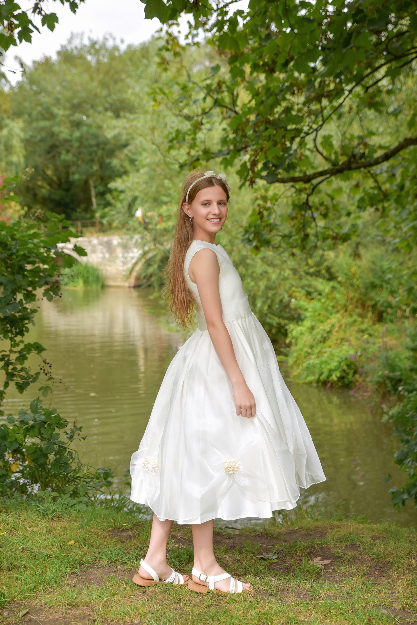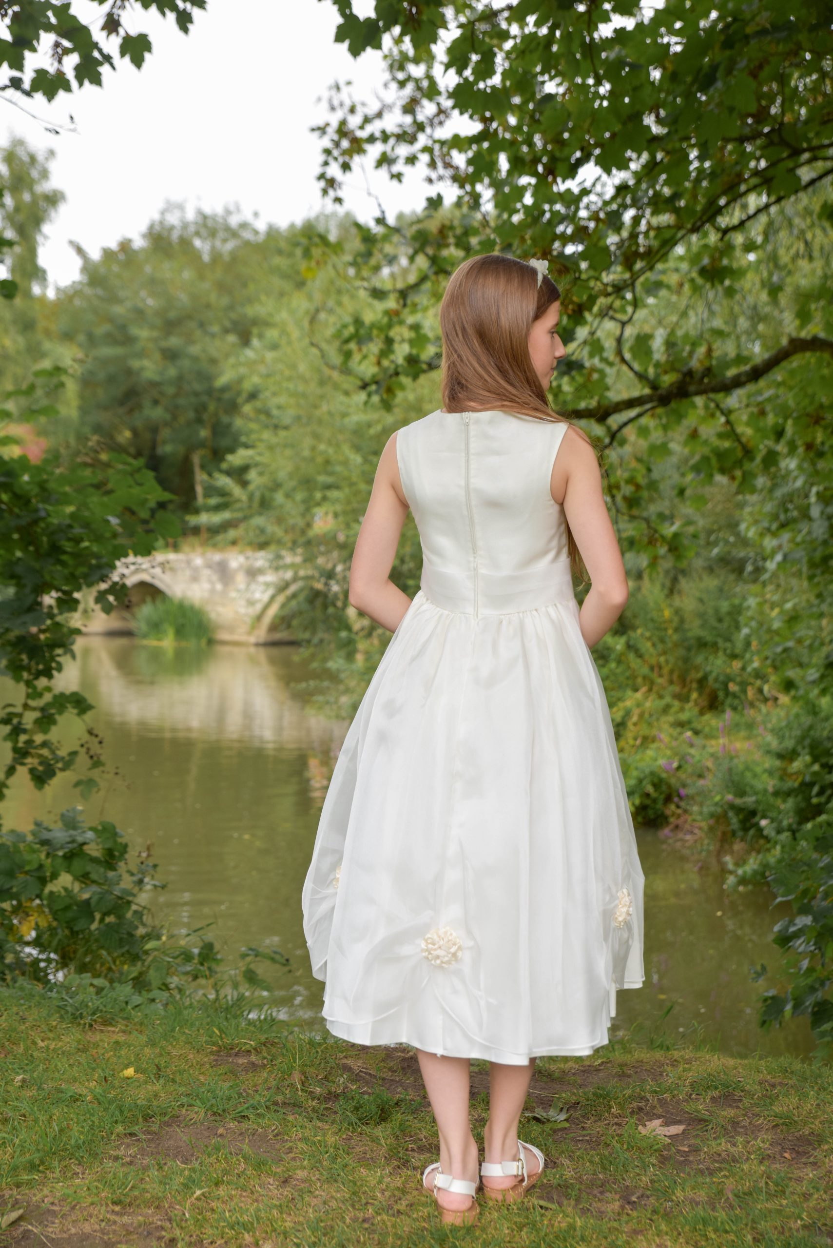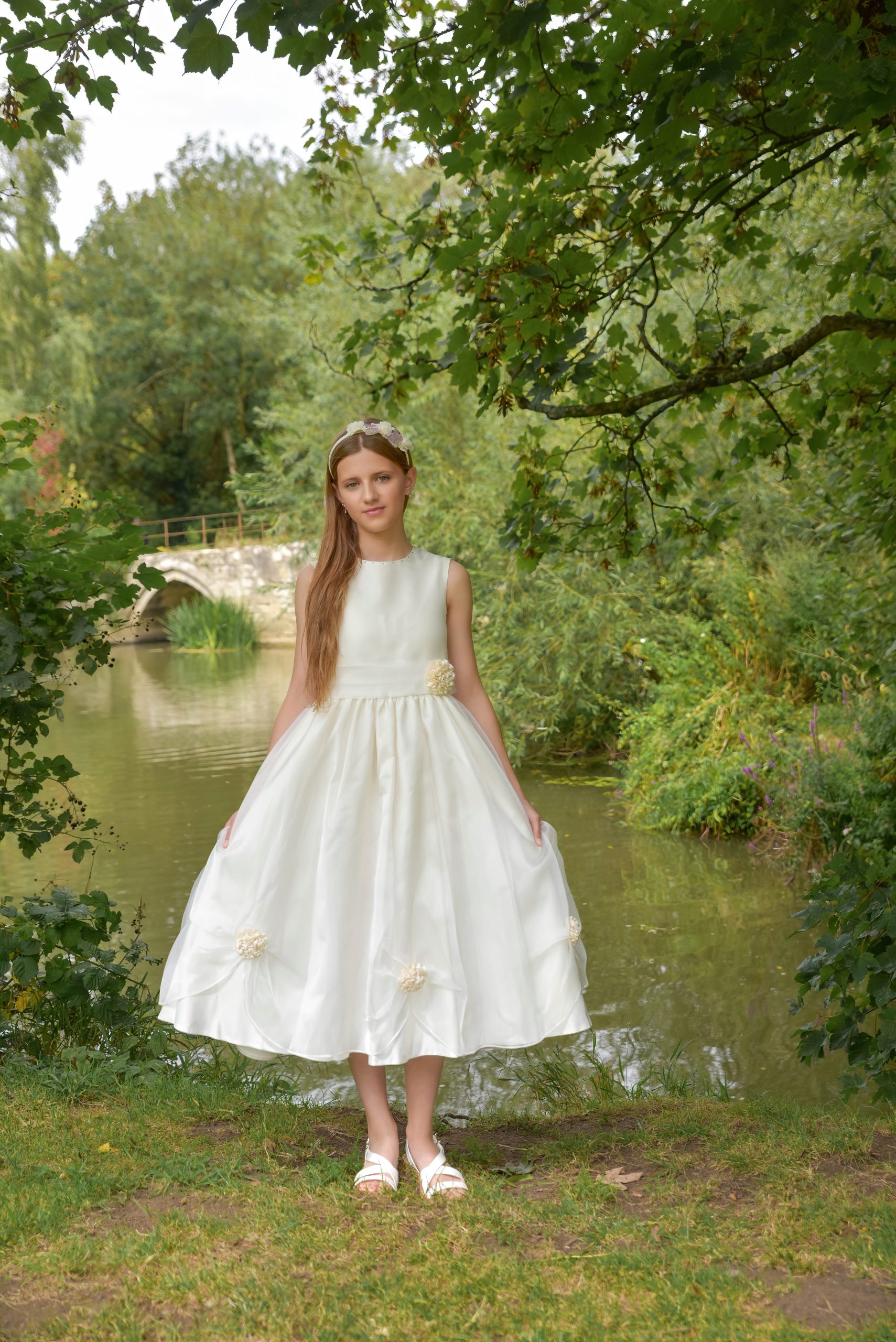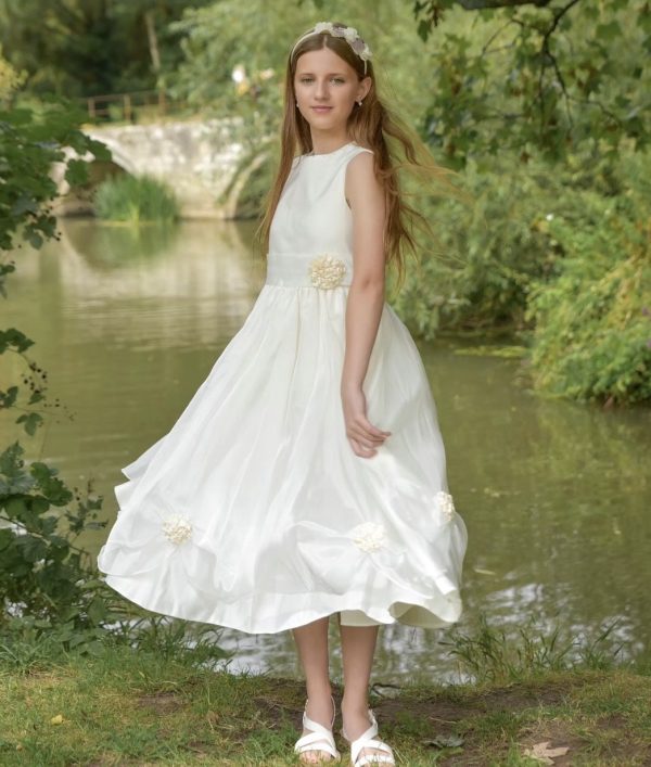 Featuring a layered waist sash, with a ivory bunched rosette floral design on the waist and skirt.
