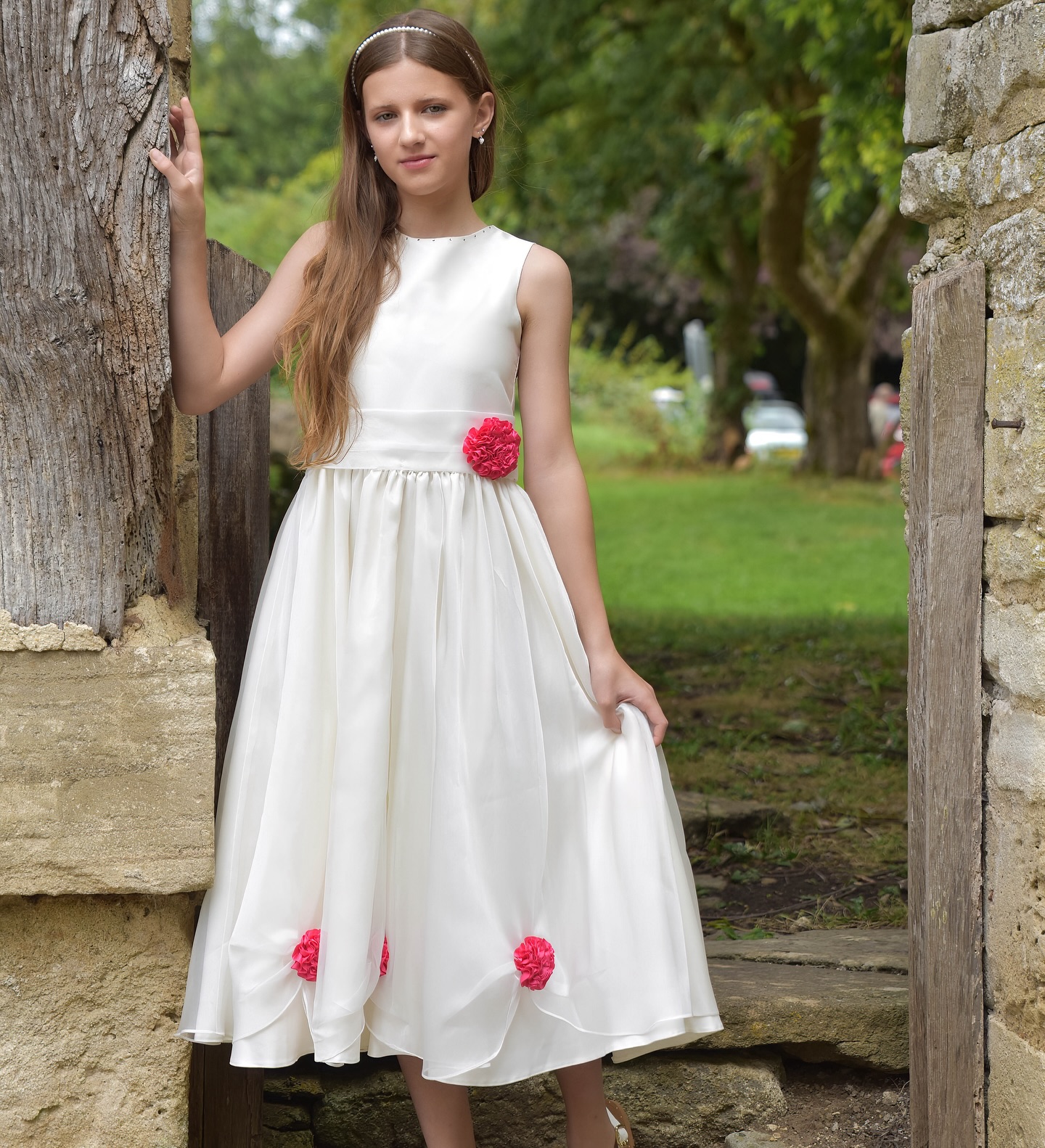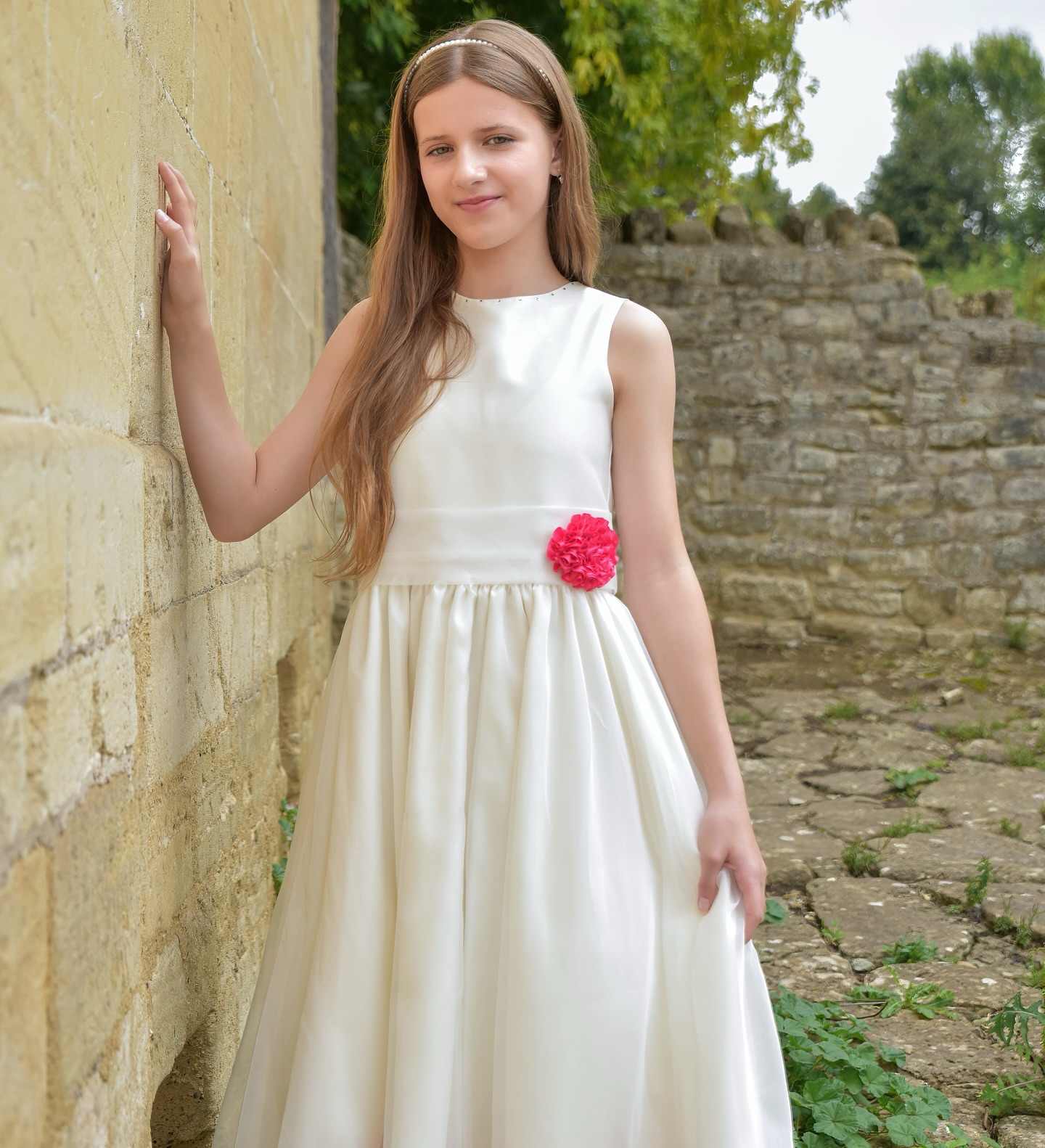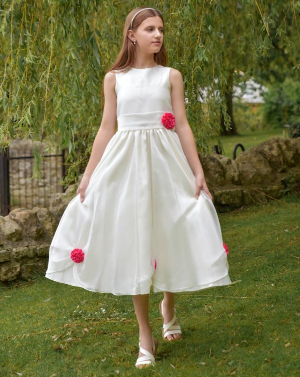 - Waistline: A layered waist sash with pink bunched rosette floral design, enhancing the elegance.