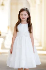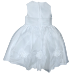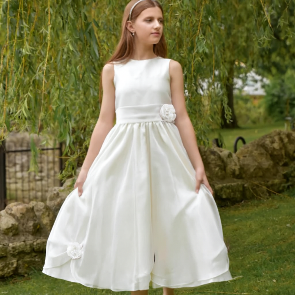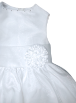 - Floral Embellishments: Bunched white rosette floral details along the waist and skirt, adding a delicate touch.