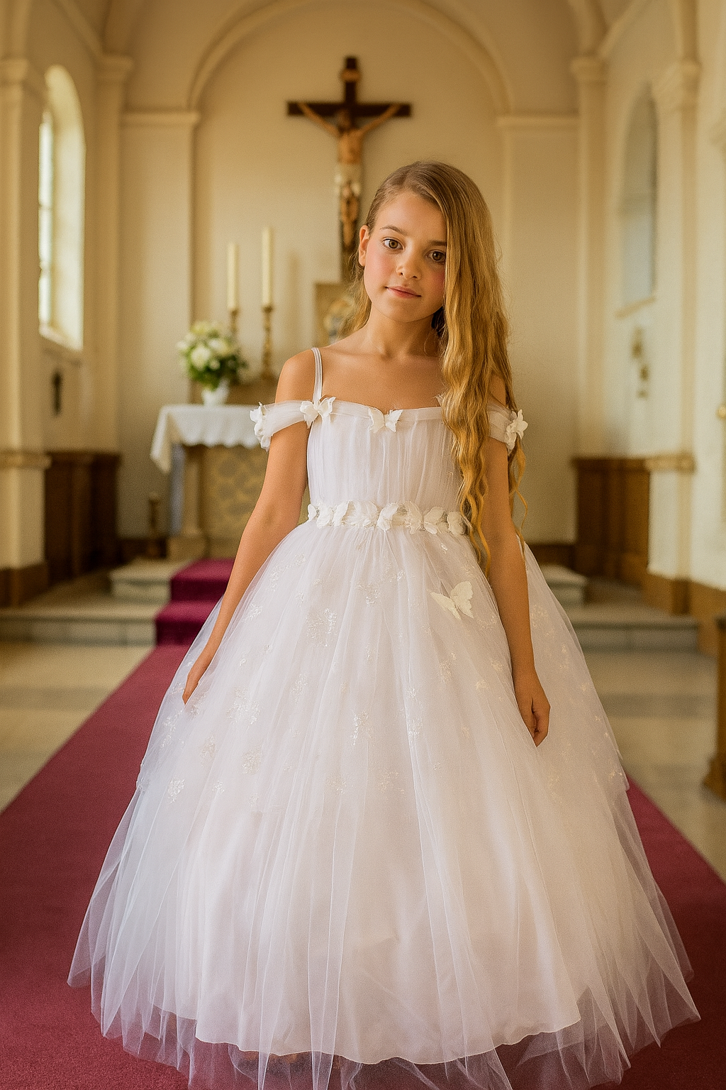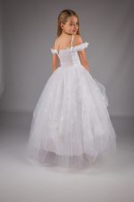 - Bodice: Features a delicate off-the-shoulder design with butterfly embellishments scattered throughout for a whimsical touch.
