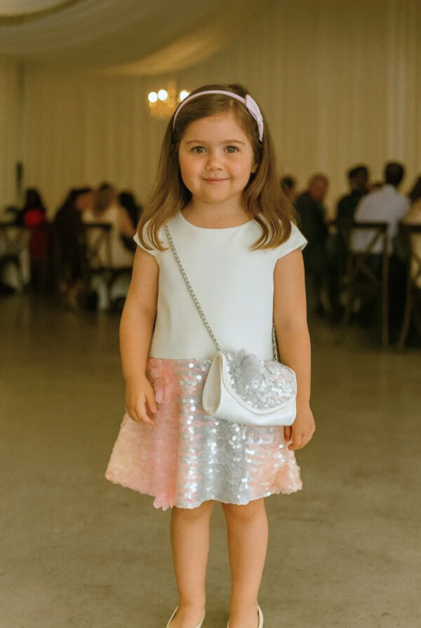 The outfit includes a matching silver crossbody bag with sequin detail, making it perfect for little ones who love accessories. The bag adds a playful and practical touch, completing the outfit with style. Fully lined and gentle on the skin, this dress is ideal for birthdays, weddings, family gatherings, holiday parties, and photo sessions.