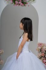 - Skirt: A satin peplum skirt with layers of tulle, creating a flowing silhouette. The dress is equipped with a hoop to add volume, giving the skirt a full, elegant look.