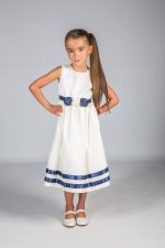 This sleeveless navy dress features a navy and white floral sash at the waist, with three navy stripes along the skirt. A navy bow at the back and a matching long-sleeve navy bolero make this shin-length dress perfect for formal occasions.