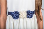 • Waistline: The waist is defined by a navy and white floral sash, adding a charming touch of contrast. The navy satin-like band around the waist enhances the sophisticated and polished look of the dress.