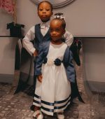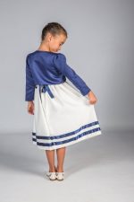 • Skirt: The shin-length skirt is adorned with three delicate navy stripes at the hem, adding a subtle but stylish detail. The flowing design gives it a formal yet playful vibe, perfect for any special event.