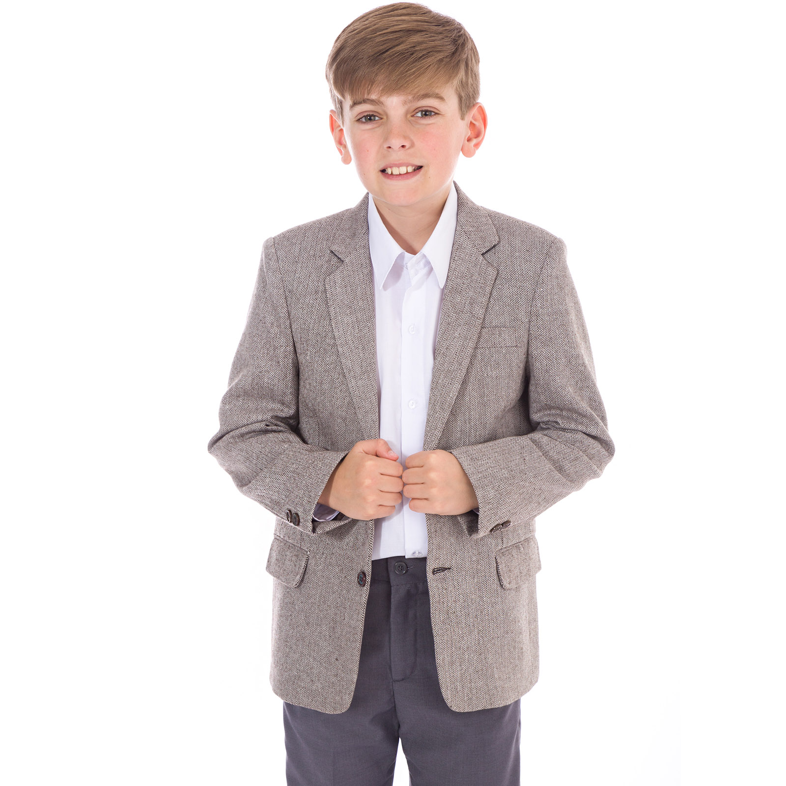 This elegantly styled suit jacket is ideal for those seeking a refined tweed finishing touch. Crafted from high-quality brown herringbone tweed, it features meticulous stitching and premium material. Perfect for formal occasions or weddings, it will help your young gentleman stand out with sophistication and grace. (Jacket only.)