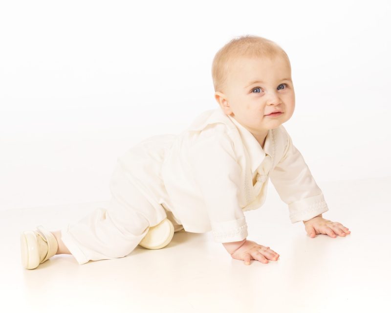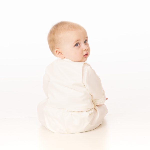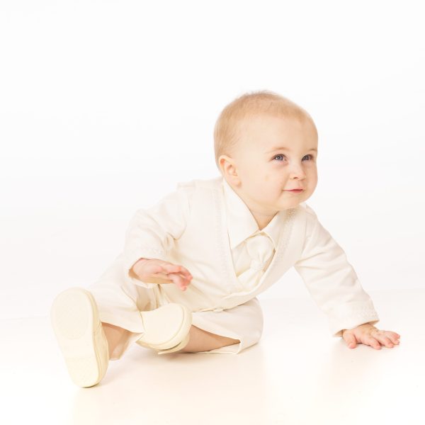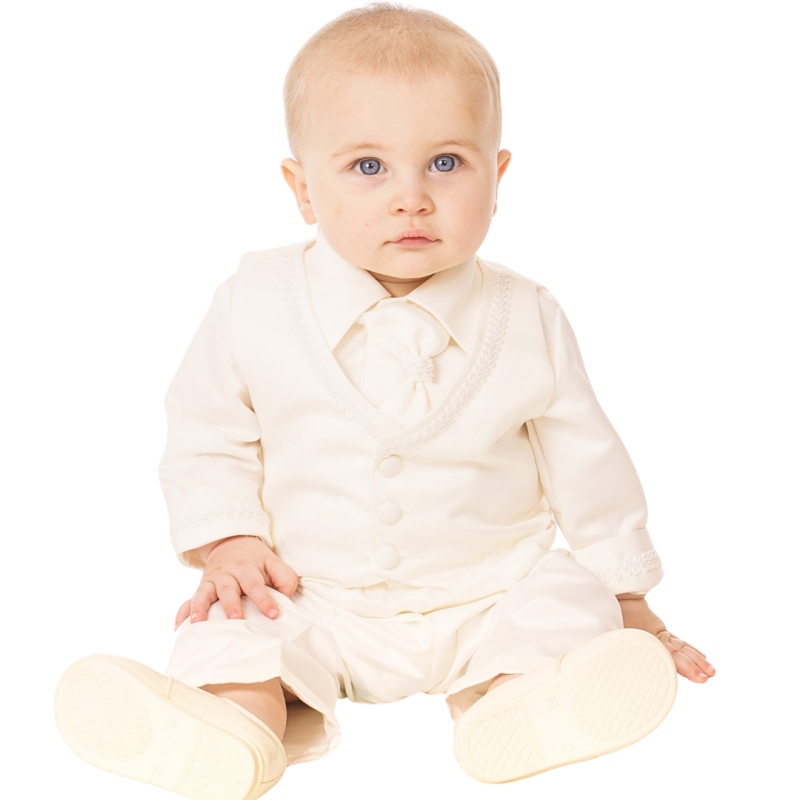 This exquisite four-piece Christening suit is thoughtfully designed to make your baby’s special day even more memorable. It includes an ivory patterned waistcoat with a coordinating cravat, ivory elasticated trousers with a satin finish, and a full-sleeve ivory collar shirt.