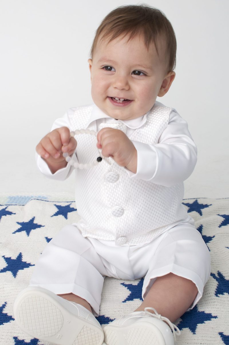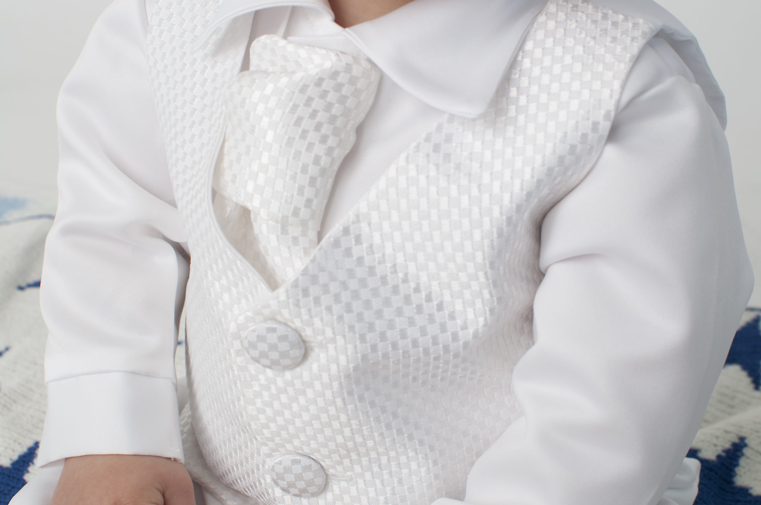 This exceptional four-piece Christening suit has been carefully crafted to ensure that your baby’s special day is truly memorable. The ensemble includes a checked white patterned waistcoat paired with a coordinating cravat, complemented by white, elasticated, satin-finish trousers and a full-sleeve white collar shirt.