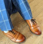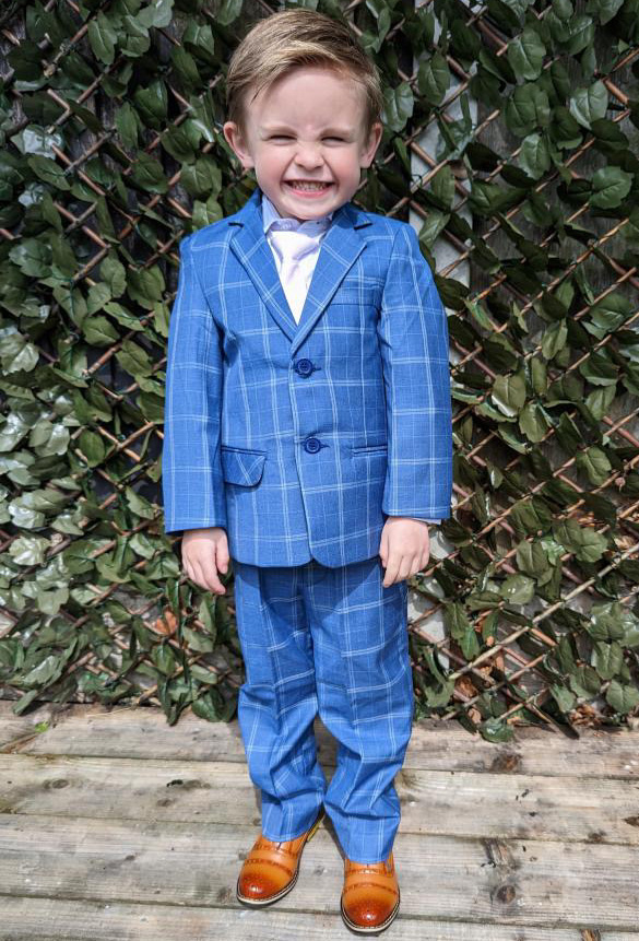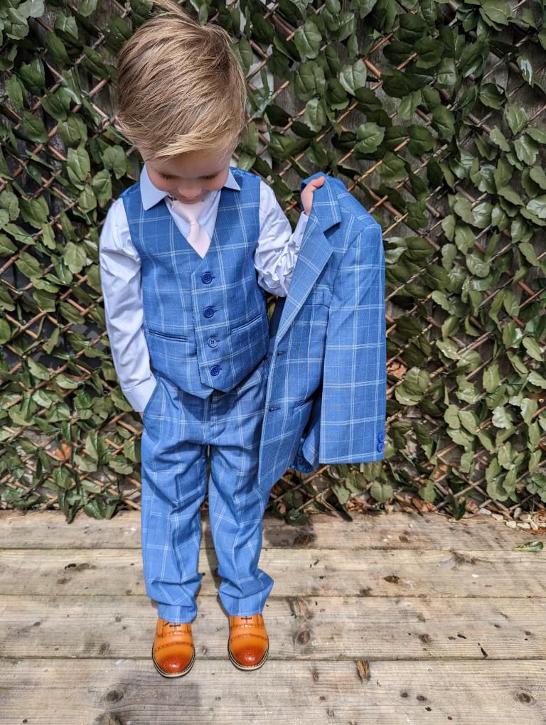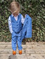 Complete the look with this stylish boys’ five-piece blue check suit. The crisp white shirt and light pink tie complement the vibrant blue suit, creating a striking and polished ensemble.