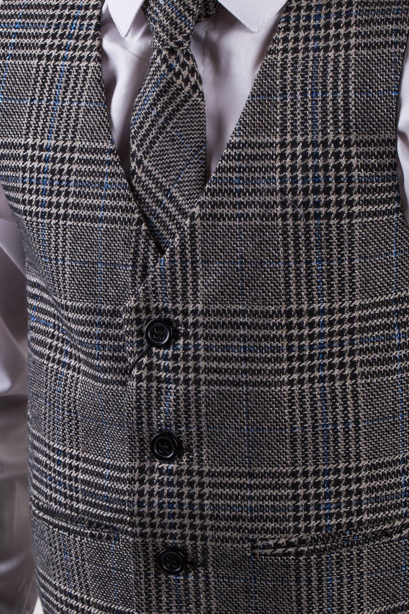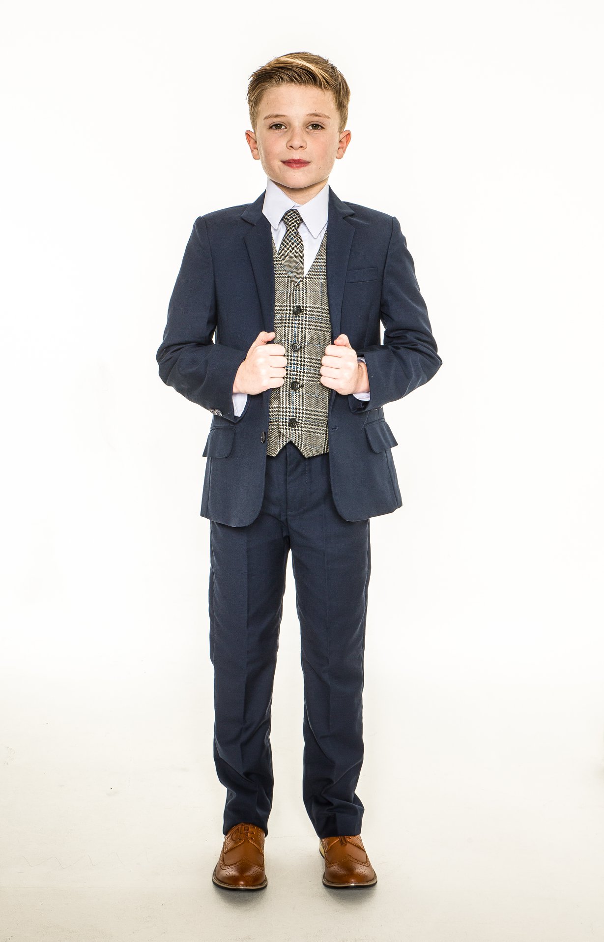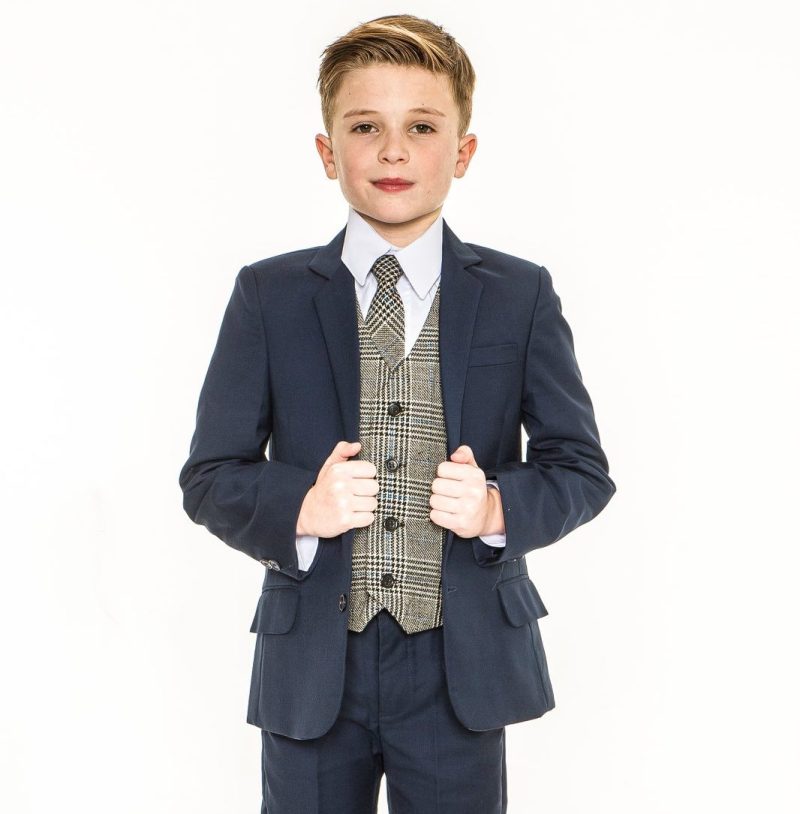 This stylish navy suit is highly eye-catching, featuring a chequered waistcoat and coordinating tie. The waistcoat’s design incorporates various lines of grey and blue tinsel, making it the statement piece of the ensemble. Subtle accents of blue within the pattern complement the navy jacket and trousers. The look is completed with a crisp white shirt for a polished appearance.