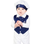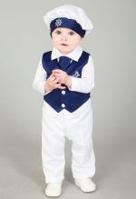 Completing the look is a matching navy cravat that exudes timeless elegance, and an irresistibly cute white hat with white embroidery that crowns the outfit with sweet perfection. every detail is designed to celebrate this cherished milestone with joy, grace, and a sprinkle of maritime magic.