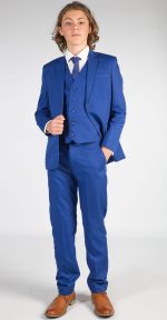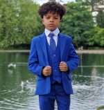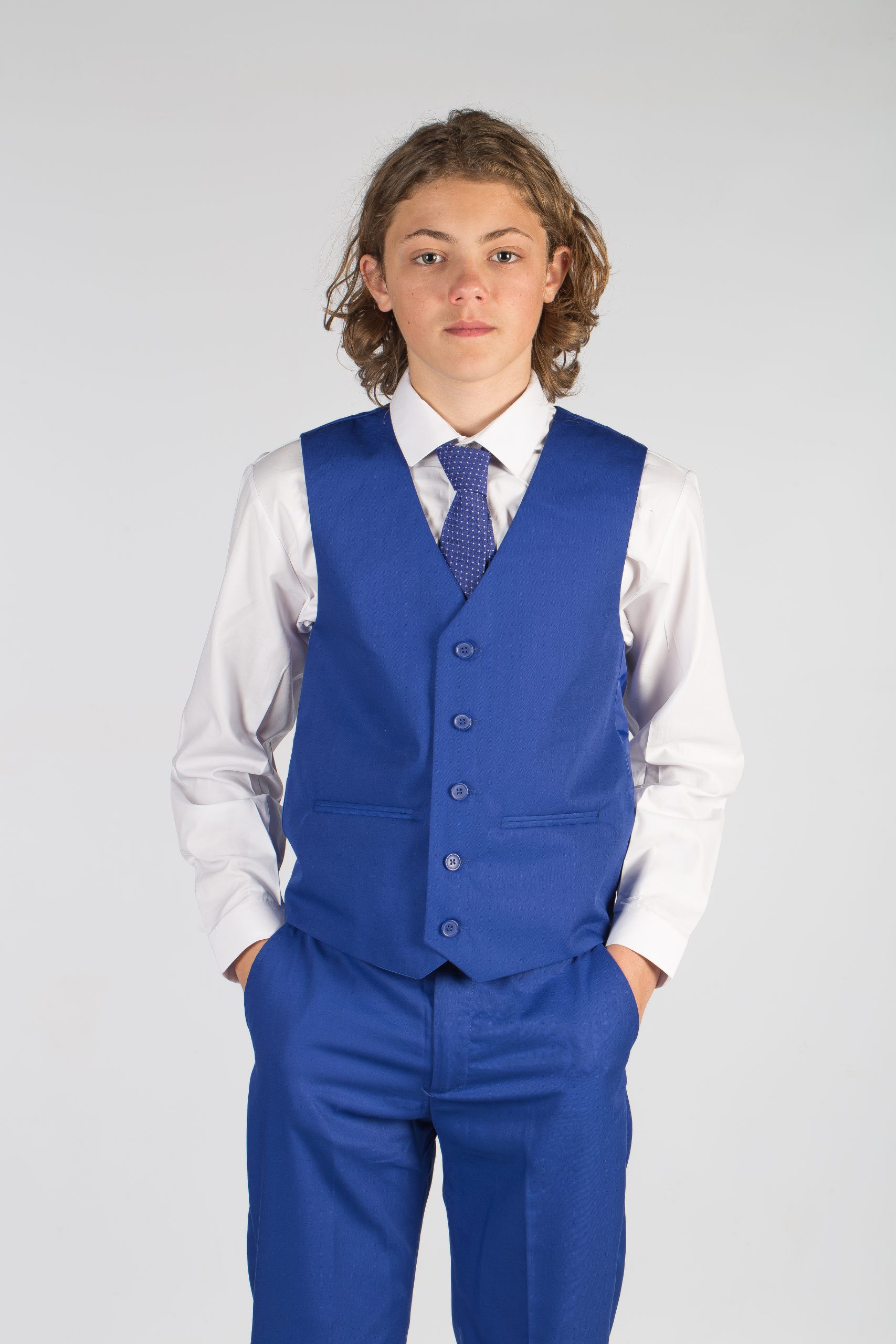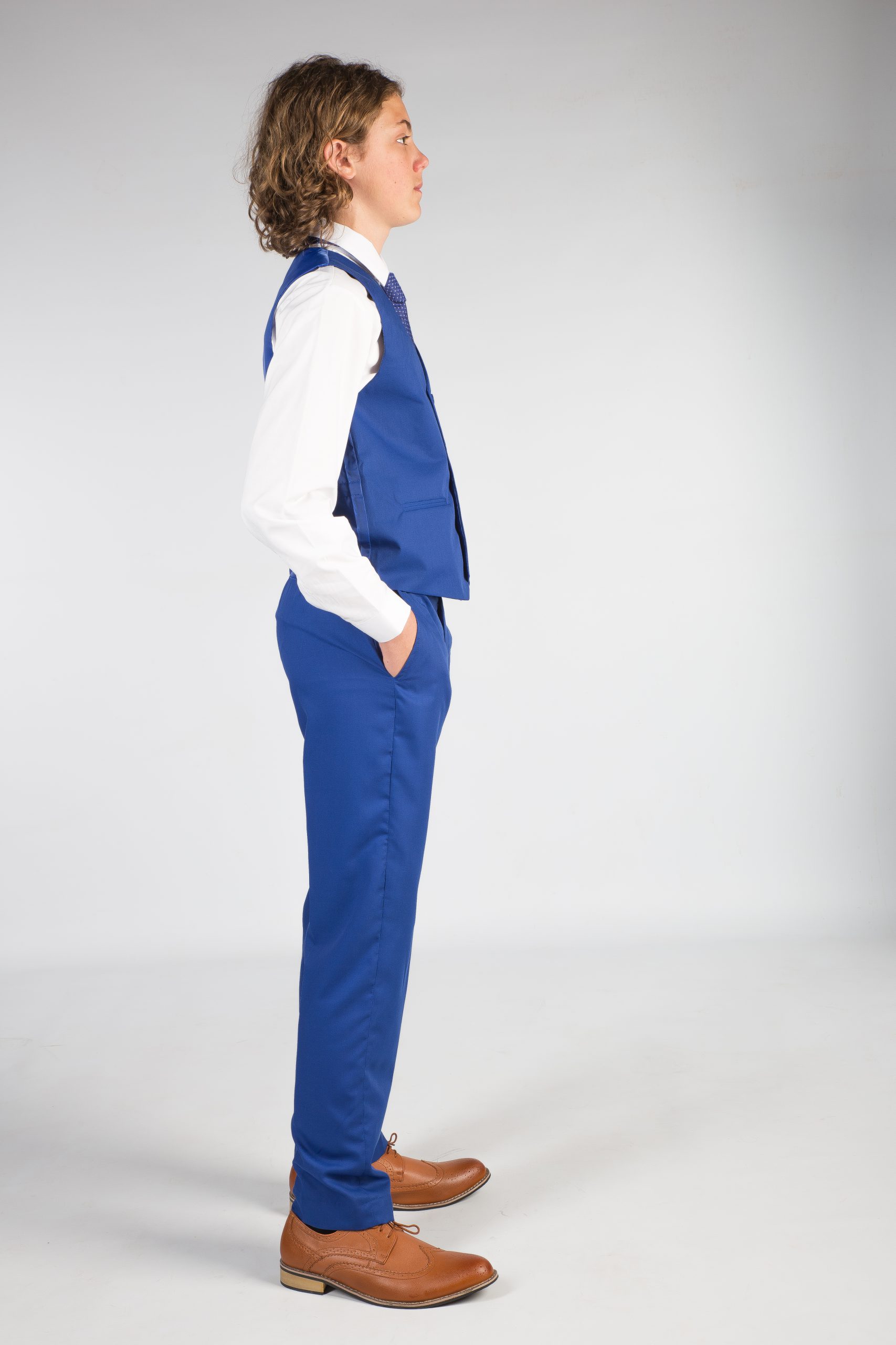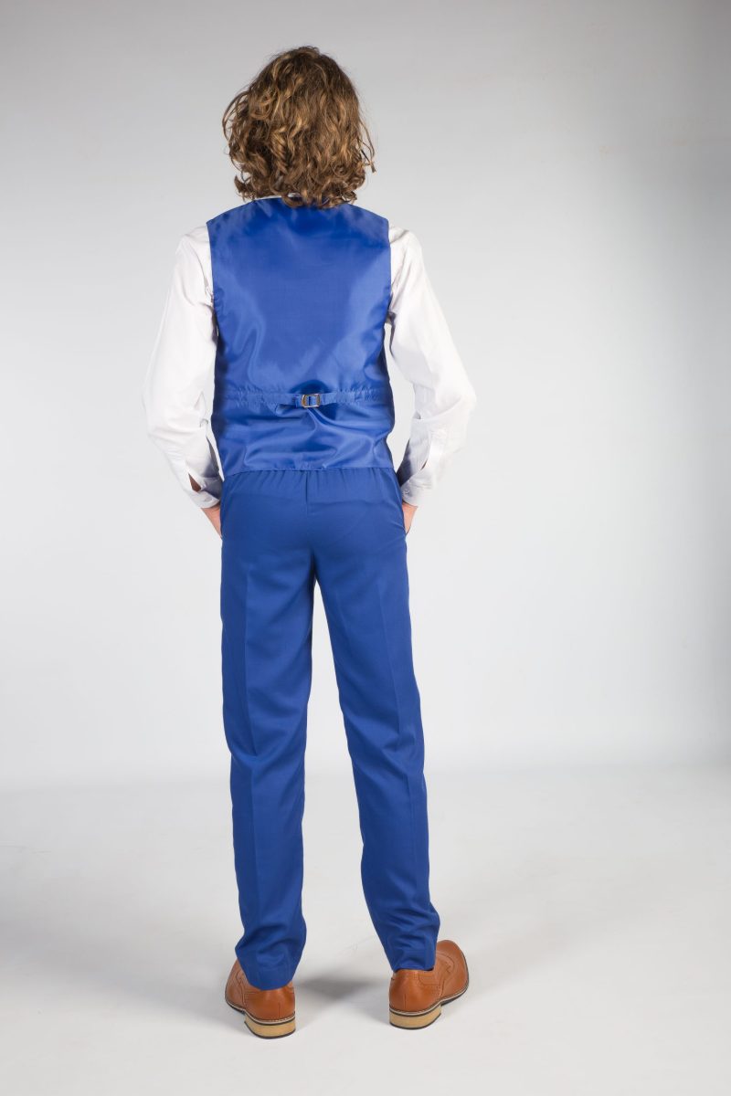 The ensemble includes a sleek two-button electric blue suit jacket, a coordinating fully lined electric blue waistcoat with an adjustable clasp for a perfect fit, a crisp white long-sleeve shirt, elasticated electric blue trousers, and a matching blue tie to complete the look.