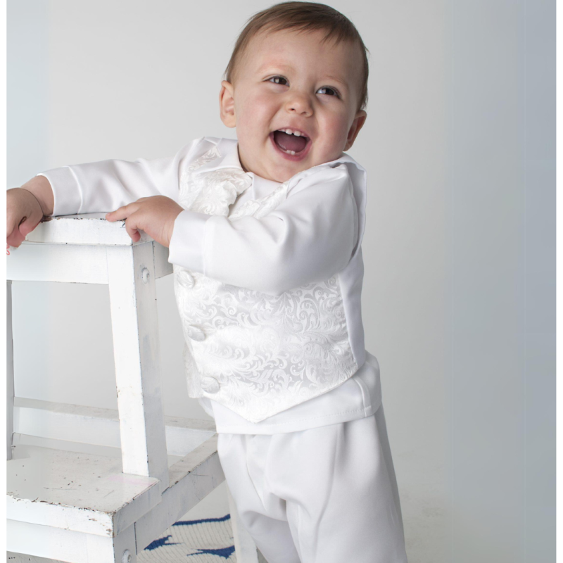 This exclusive 4-piece christening suit is thoughtfully designed to make your baby’s special day memorable. It includes a white paisley-patterned waistcoat with a matching cravat, paired with white elasticated satin-look trousers and a full-sleeve, white collar shirt.