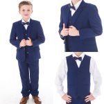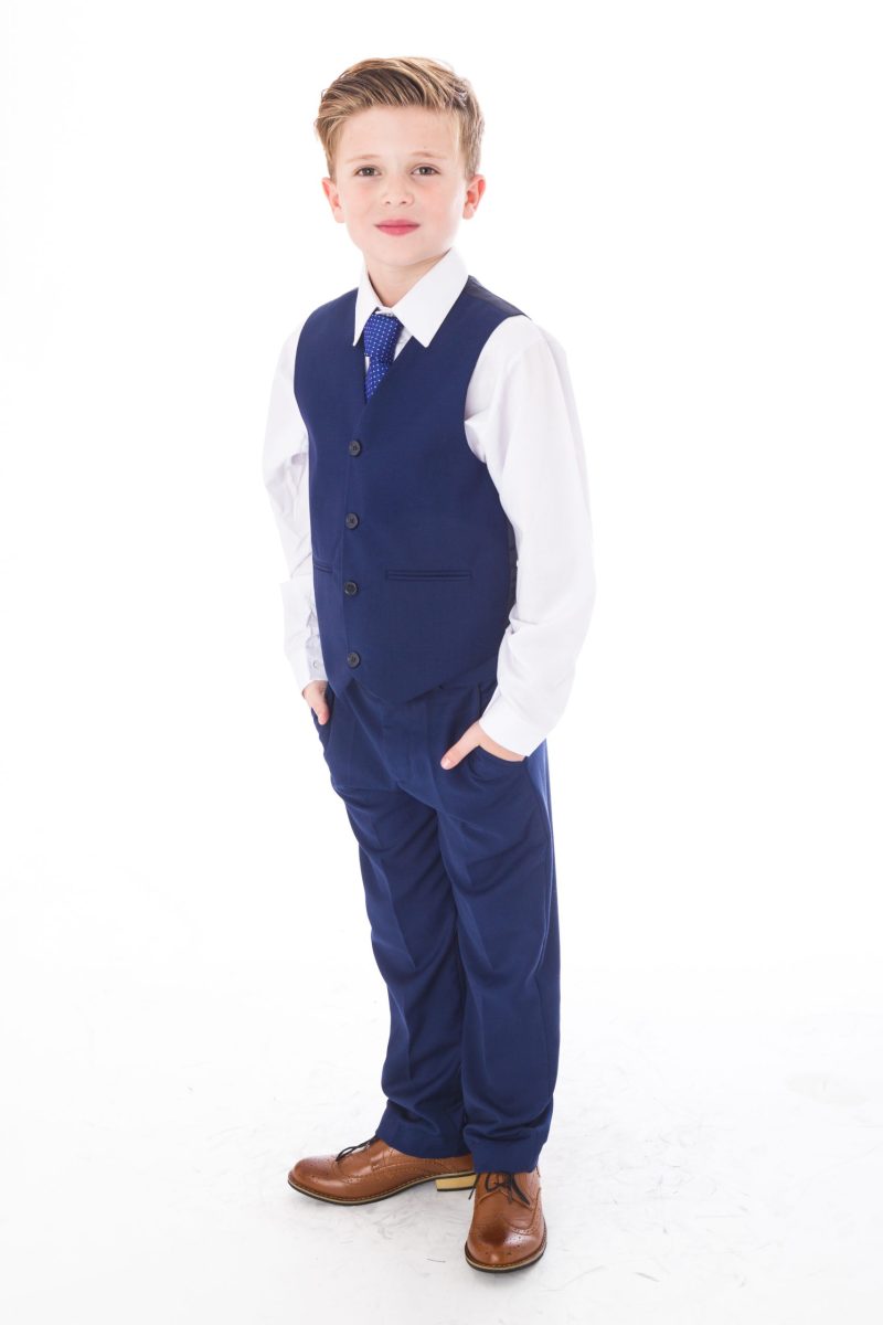 This ensemble includes a tailored, two-button navy blue suit jacket, a coordinating fully lined navy blue waistcoat with an adjustable clasp for a customized fit, a crisp white long-sleeved collared shirt, navy blue elasticated trousers, and a matching blue dotted bowtie for the finishing touch.