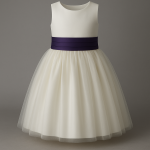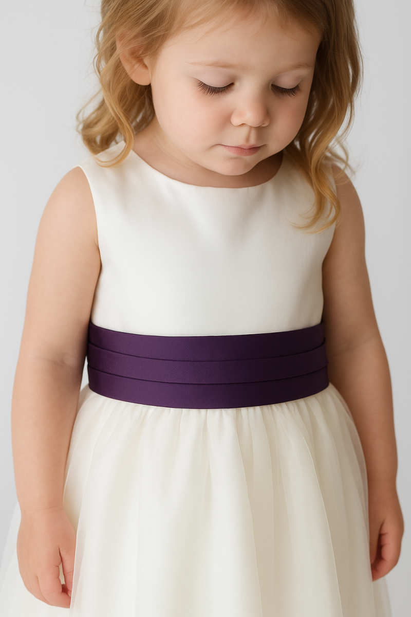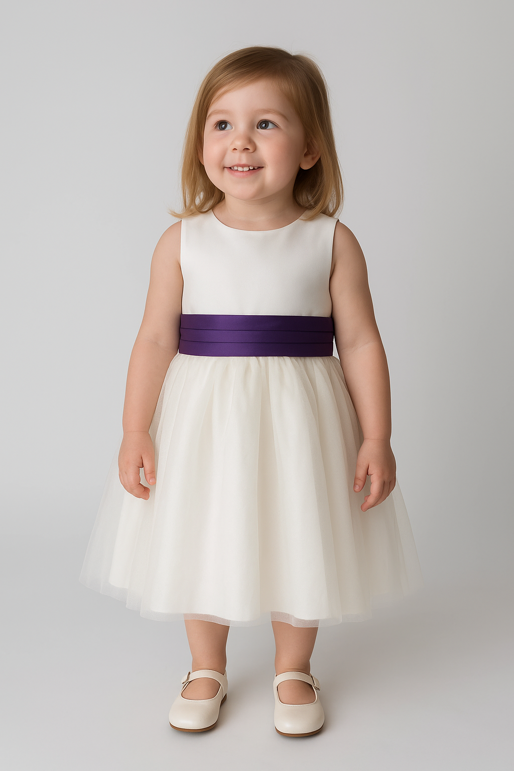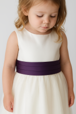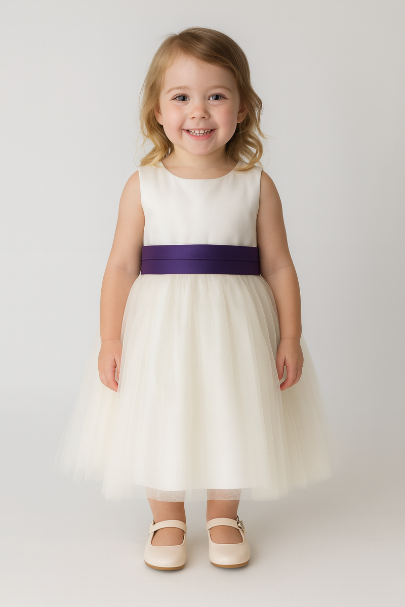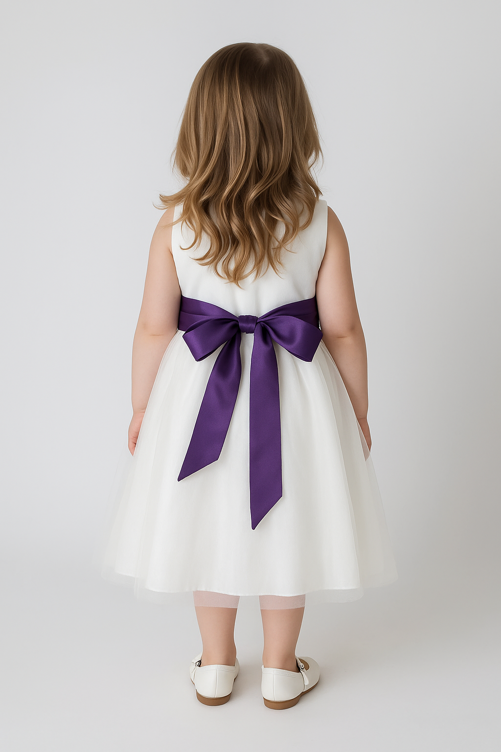 - Waistline: Accented with a refined purple satin sash, adding a subtle pop of colour that enhances charm and sophistication.