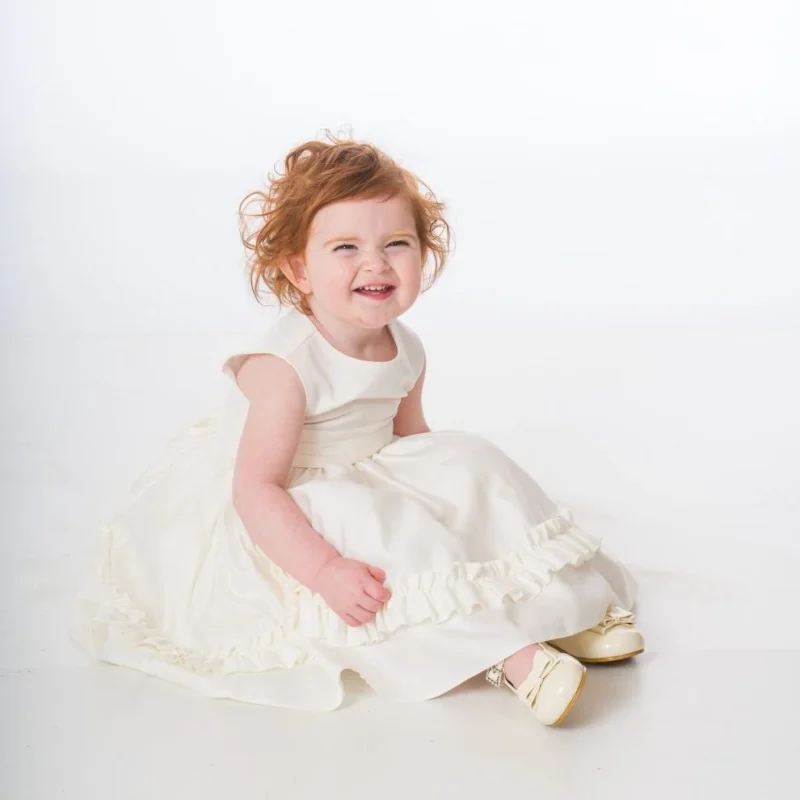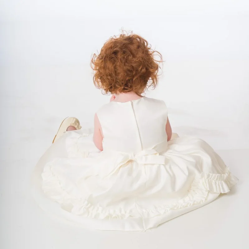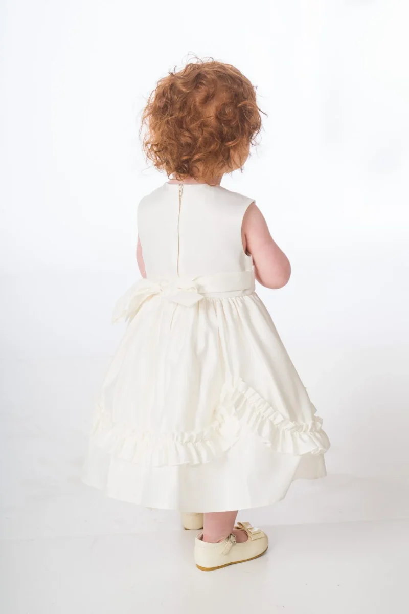 The Olivia Dress in Ivory by Visara has a simple, elegant bodice, a lovely layered sash at the waist, and a beautiful satin skirt adorned with a charming ruffled rose design. It’s a knee-length dress that’s perfect for bridesmaids, flower girls, or just adding a touch of specialness to any occasion.