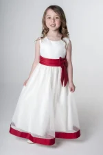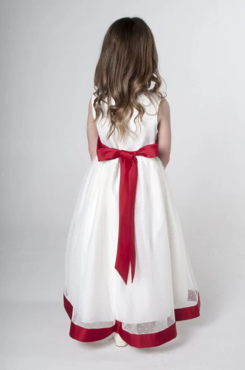 The Alice dress in red features a layered satin and tulle skirt, complemented by a red sash at the waist and a bow at the back. This ankle-length dress provides an elegant and sophisticated appearance, making it suitable for formal or special occasions.