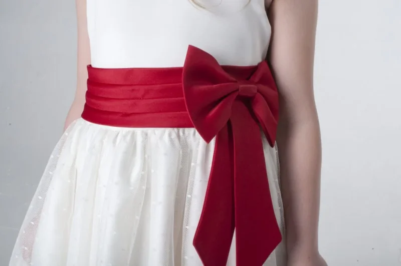 • Bodice: The dress features a fitted bodice that creates a sleek and elegant silhouette. A red sash around the waist adds a refined touch and is finished with a bow at the back, accentuating the waistline.