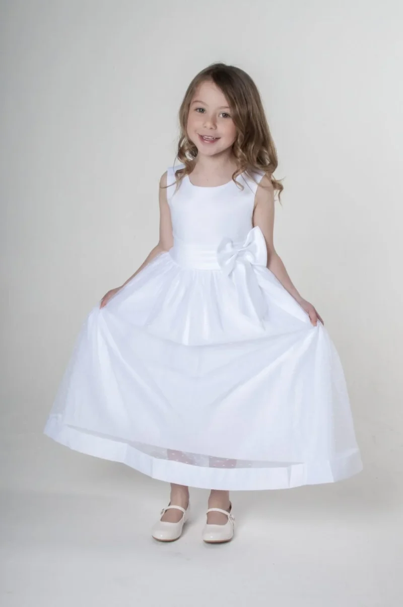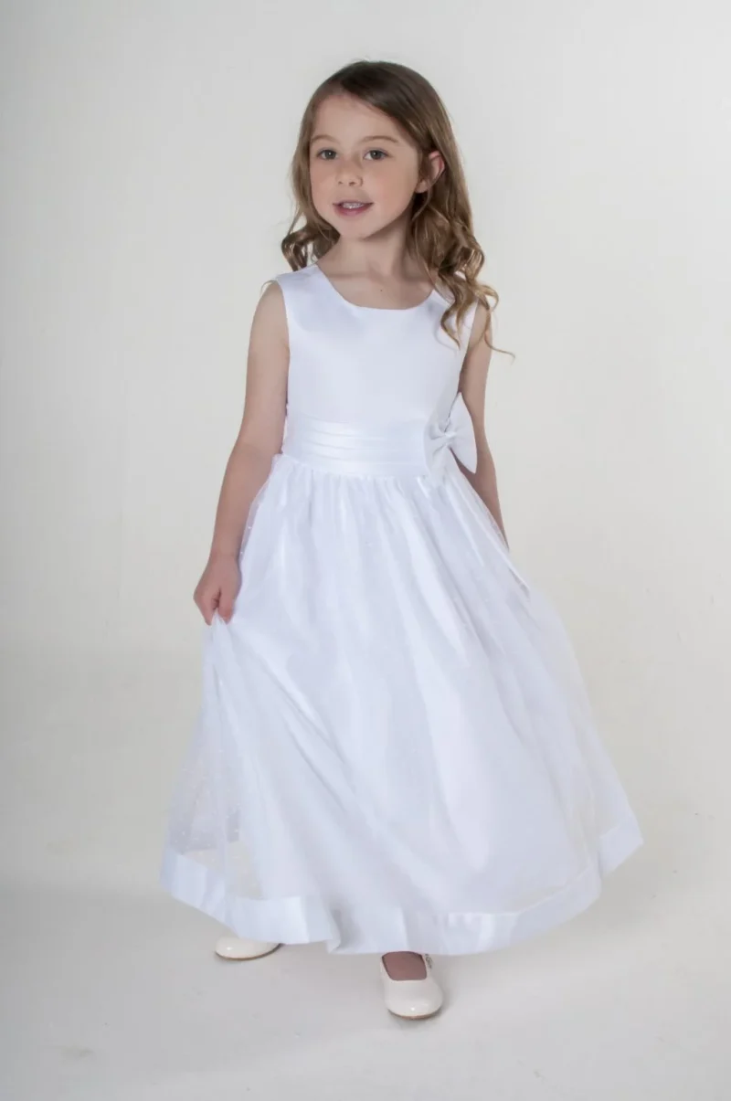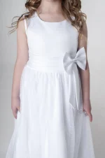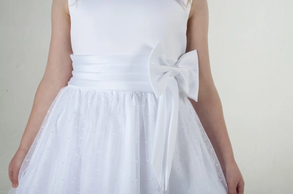 - Bodice: The dress features a tailored bodice that creates a sleek and sophisticated silhouette, complementing the layered skirt design. A white sash around the waist adds an element of refinement and is finished with a bow at the back to subtly accentuate the waistline.