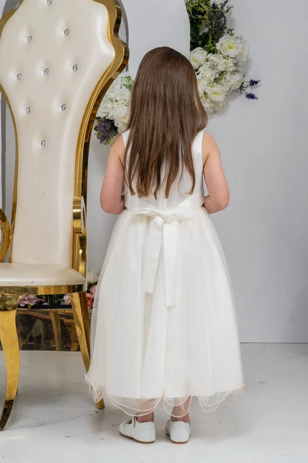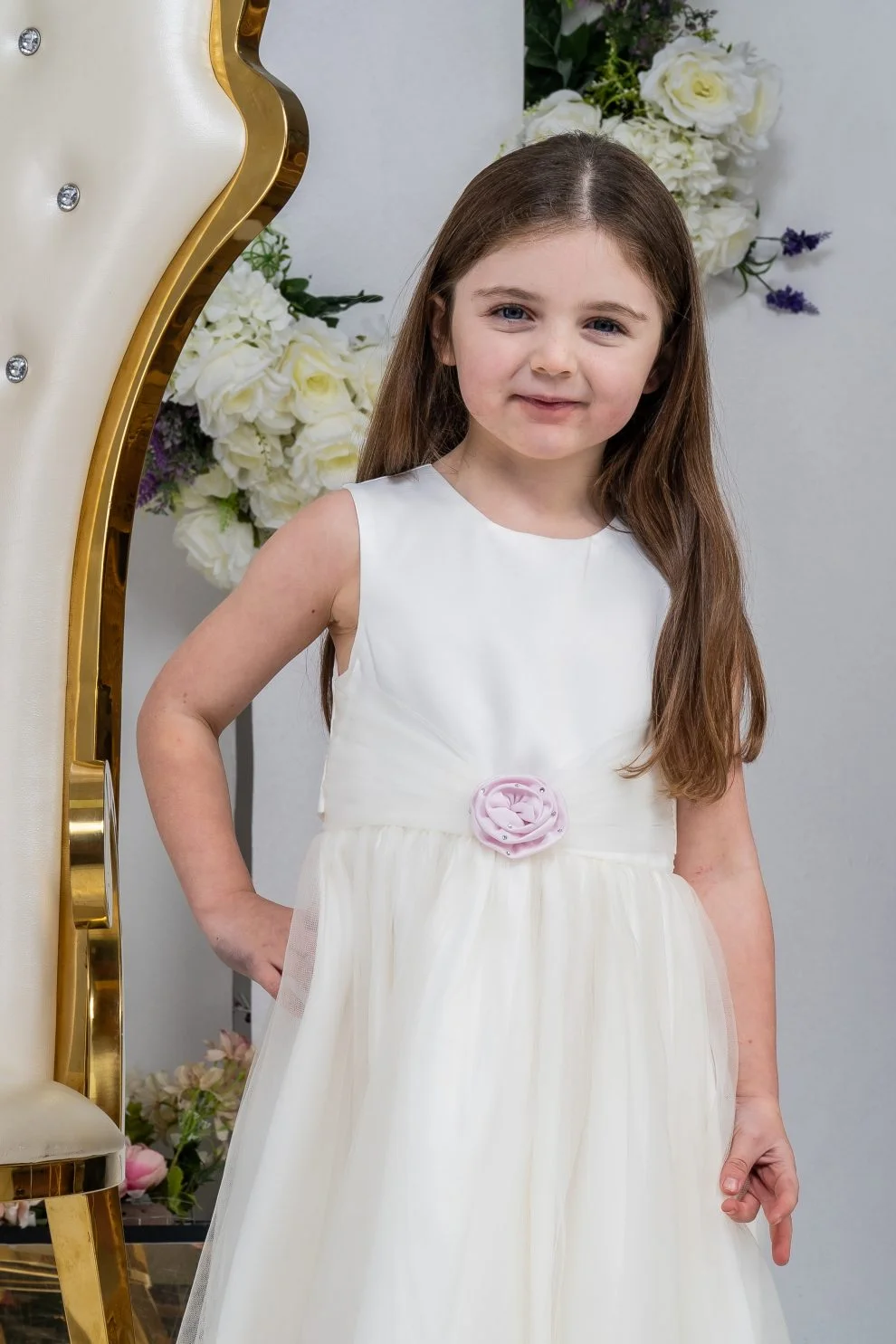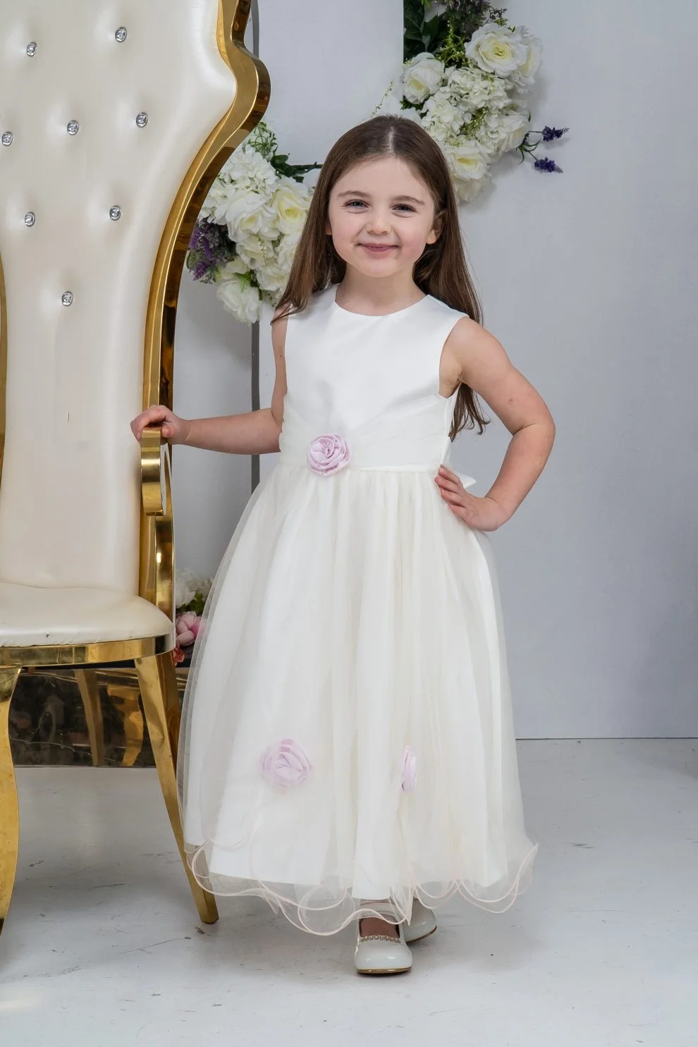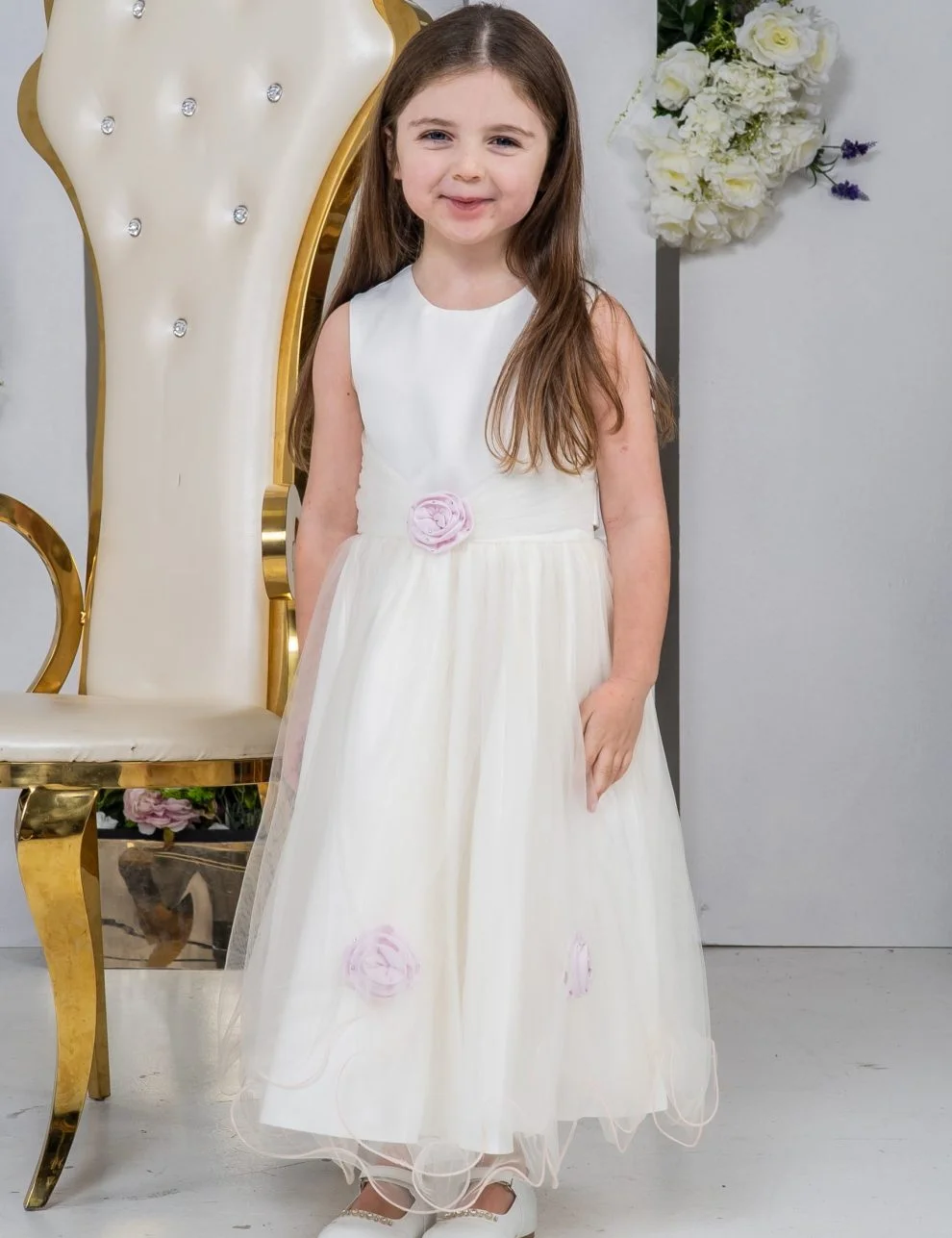 This lovely ivory sleeveless dress is accented with a charming pink rosebud sash at the waist. It has sweet bunched rosebud details along the hem and a delicate dotted rosebud mesh skirt that adds a touch of whimsy. The dress is beautifully finished with a satin-like white waistline and a pretty big bow at the back, making it a truly elegant and feminine choice.
