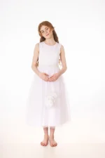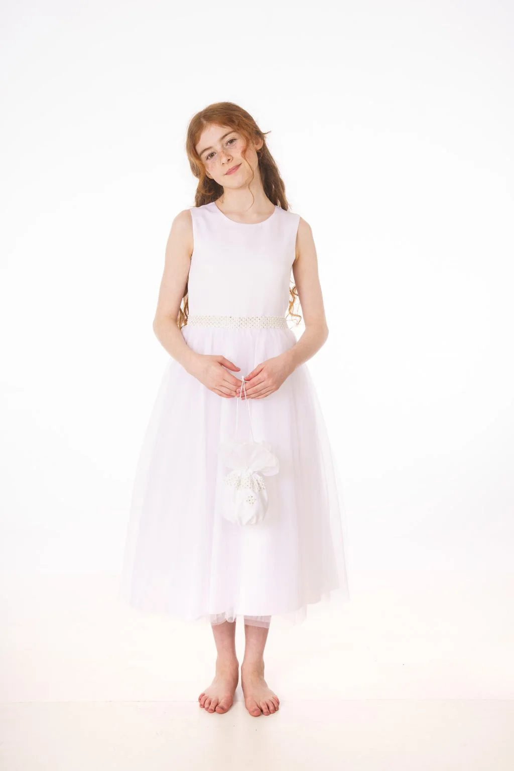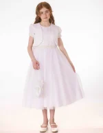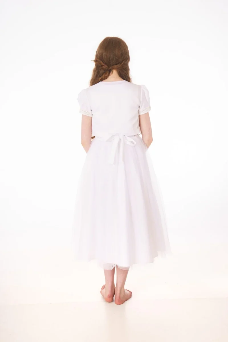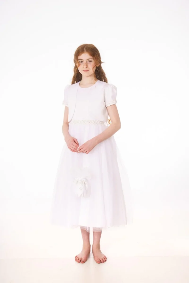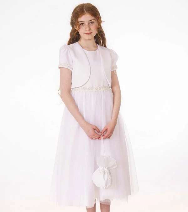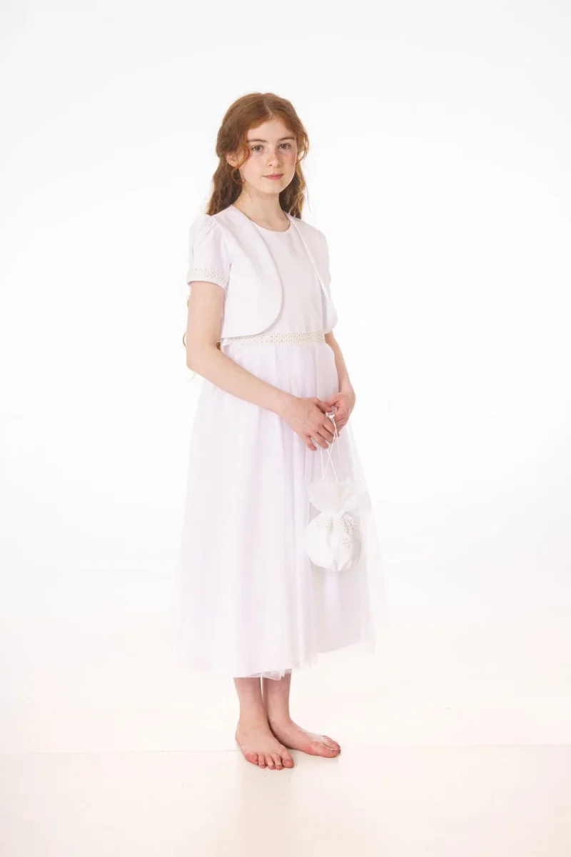 The Girls White Dress by Visara features a simple ivory bodice, a layered skirt, and a beaded waistline. It is accompanied by a short-sleeve bolero with beaded sleeve edges and a matching beaded bag, making it an excellent choice for any formal occasion.