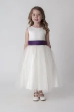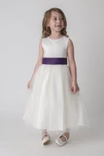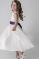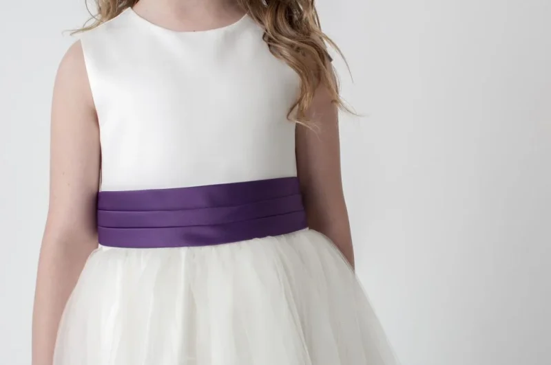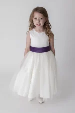 • Waistline: Accented with a refined purple satin sash, adding a subtle pop of colour that enhances charm and sophistication.