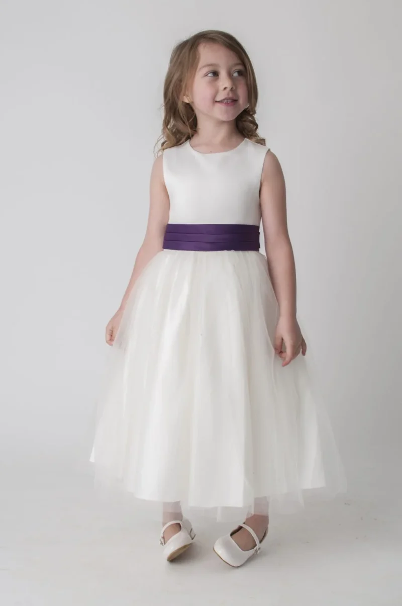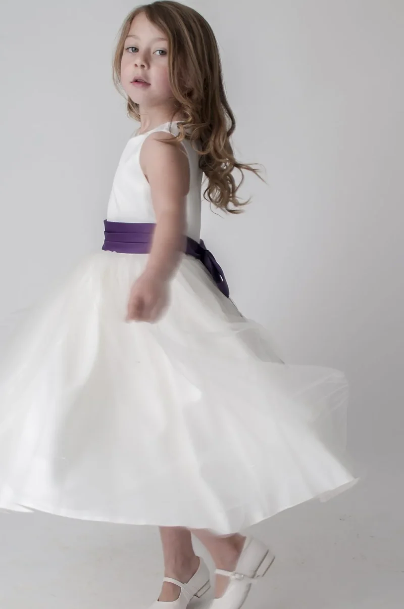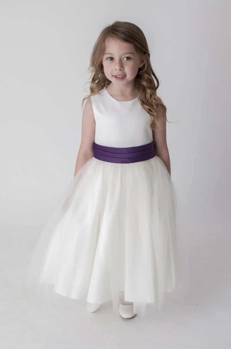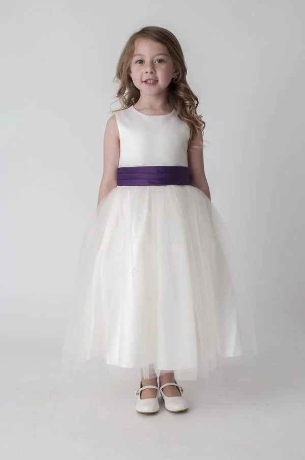 The Kate Dress in Ivory with a purple sash embodies timeless elegance complemented by a subtle accent of colour. Its flowing tulle skirt and minimalist design make it an excellent choice for formal occasions.