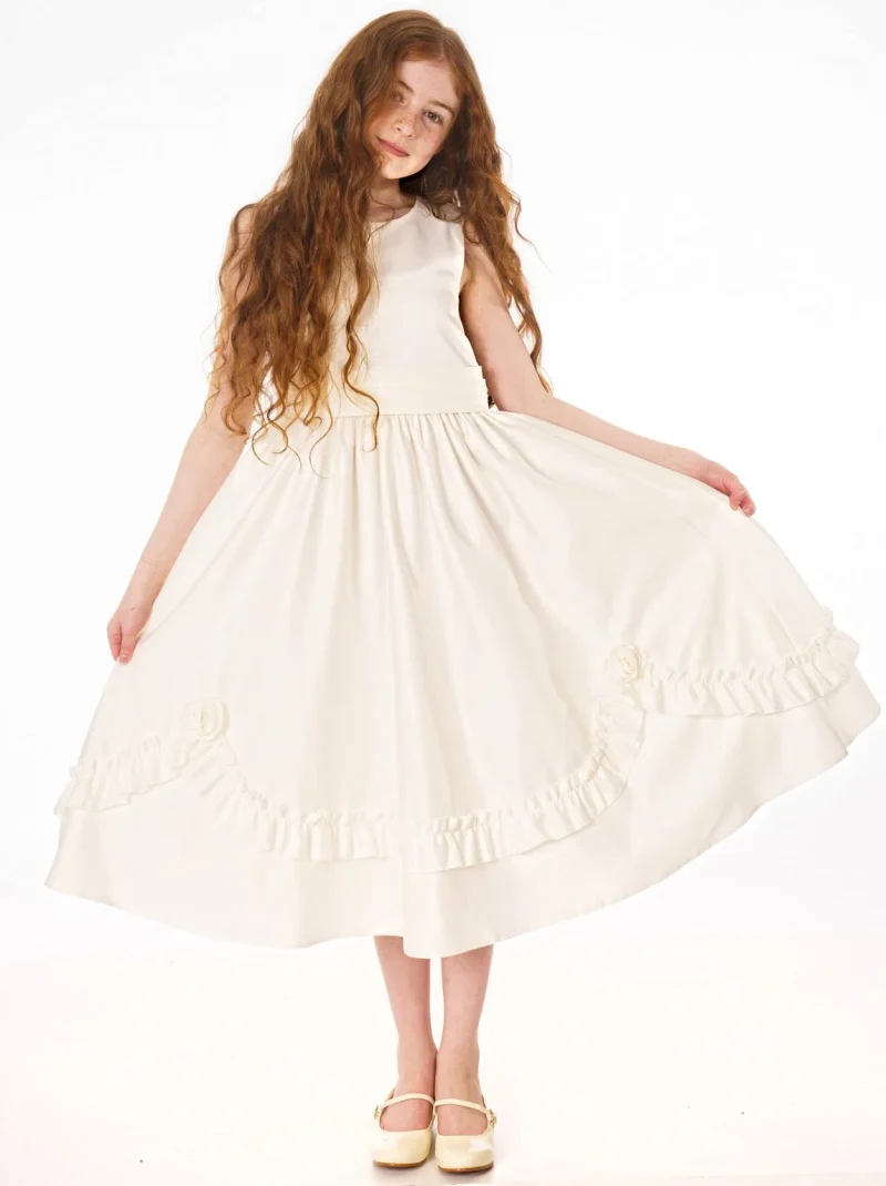 The Olivia Dress in Ivory by Visara has a simple, elegant bodice, a lovely layered sash at the waist, and a beautiful satin skirt adorned with a charming ruffled rose design. It’s a knee-length dress that’s perfect for bridesmaids, flower girls, or just adding a touch of specialness to any occasion.