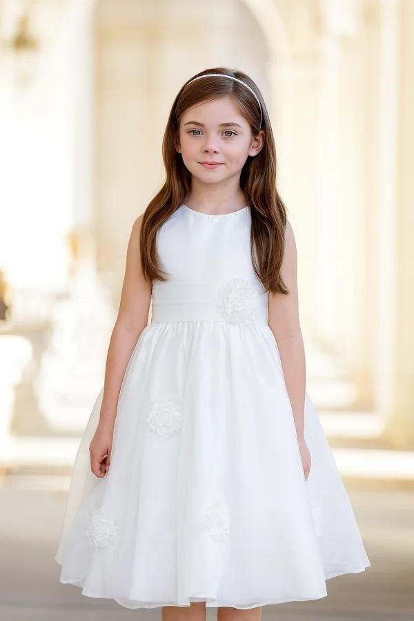 Waistline: Accentuated with a beautifully layered sash to enhance the overall shape. - Floral Embellishments: Adorned with clustered white rosette floral accents along the waist and skirt, offering a subtle decorative element.